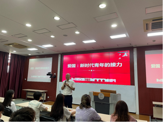 课堂第一环节由上海对外经贸大学马克思主义学院罗国辉副教授主讲,他通过古往今来的事例,从何为爱国、为什么要爱国、怎样爱国三个方面系统讲解了新时代爱国主义的内涵,以及青年大学生的爱国体现与责任担当。