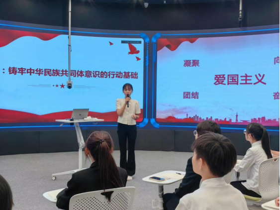 在喜迎中华人民共和国成立74周年之际,两校三地共同开展这堂大思政课。在上海对外经贸大学马克思主义学院党总支副书记刘海泉的主持下,“爱国:时代青年的价值取向”;爱国:铸牢中华民族共同体意识的行动基础”;“爱国:青春勃发的自觉担当”等三个环节依次展开。