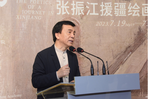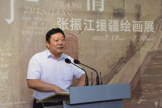 作品捐赠仪式过后,梁宇致辞。他高度肯定了张振江的艺术创作和援疆的奉献精神,并且宣布展览开幕。