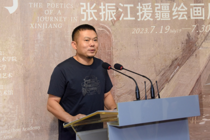 本次展览的策展人胡斌首先致辞。他简要介绍了张振江的创作经历及此次展出的作品内容。他表示,张振江在高质量完成援疆工作之余,积极响应国家“文化润疆”政策,创作了大量表现援疆人、情、事、物的绘画作品,而这个展览就是这些作品的一次小而精的呈现。