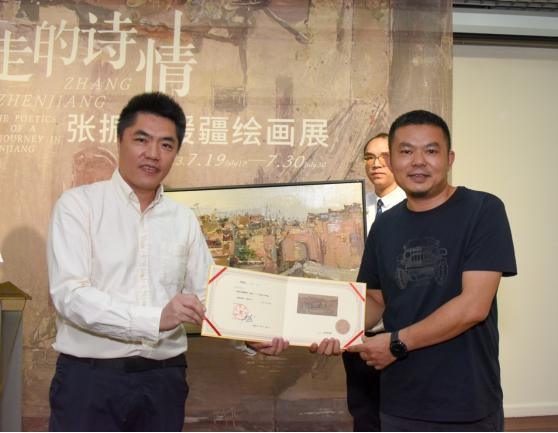 随后,张振江向深圳美术馆捐赠作品,深圳美术馆副馆长王子蚺为其颁发收藏证书。