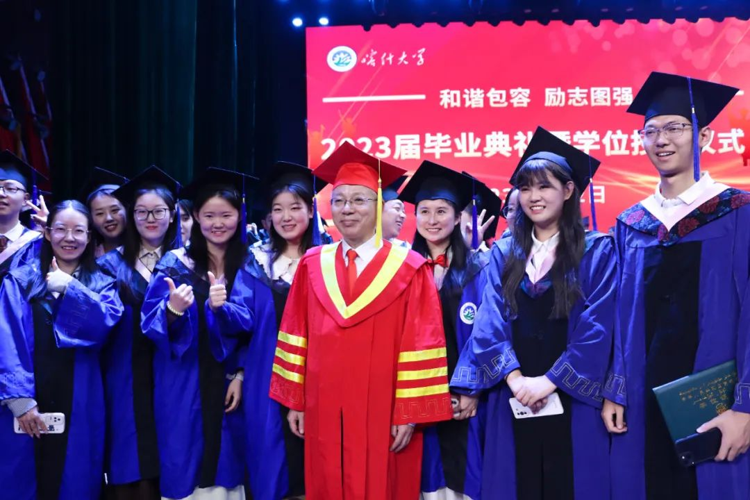校领导、学位委员会委员和导师代表向2023届毕业生们拨穗正冠,颁授学位证书,并合影留念。