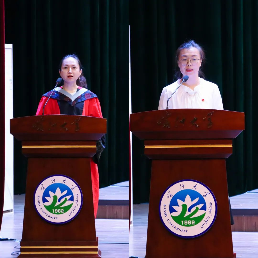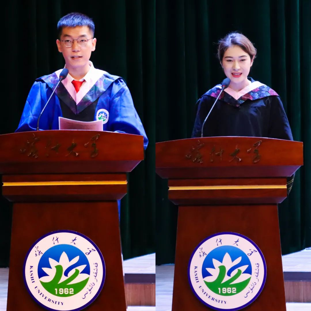 研究生教师代表阿迪拉·阿布都热西提、本科生教师代表彭慧为能现场见证毕业生在校期间的高光时刻表示荣幸,并向毕业生顺利毕业表示祝贺,希望喀大学子都能在未来属于自己的舞台上用其所用、展其所长、绽放青春。